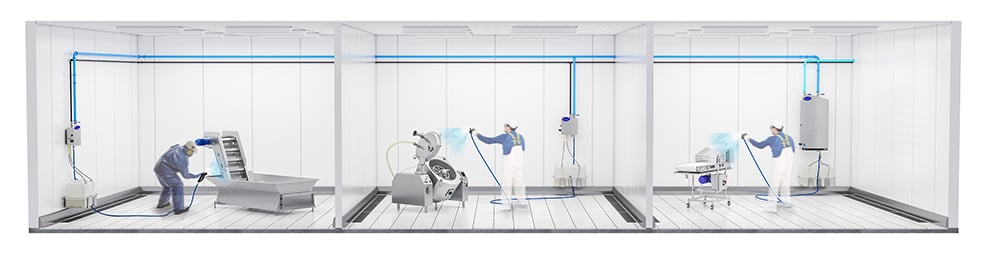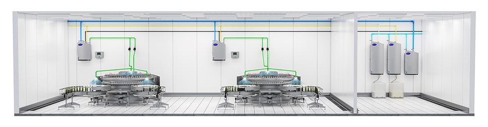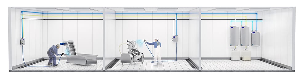 Manual centralized OPC is optimal for plants where concentrated chemicals are not allowed inside the process rooms. In a centralized configuration, all chemicals are pre-diluted in a separate, isolated chemical room and distributed through a series of pipelines. In the chemicals room, the rinsing water pressure is boosted by means of a multi-stage pump. Each satellite OPC unit will receive pre-diluted cleaning foam, pre-diluted sanitizer, and boosted pressure water.