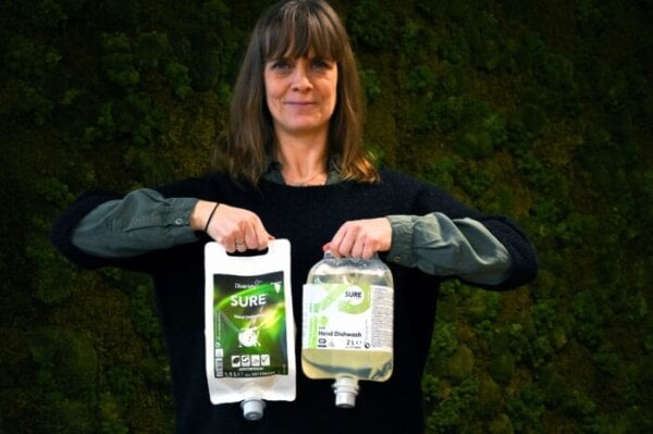 – De har blitt større for å få flere bruksløsninger per refill, det betyr mindre emballasje per liter hos kunden enn før, forklarer Camilla.