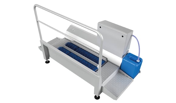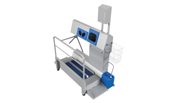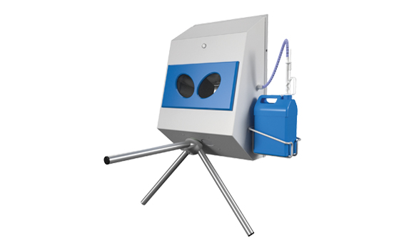 Os sistemas de controle de acesso são projetados para limpar as solas e desinfetar as mãos ao mesmo tempo. As escovas giratórias limpam as solas enquanto a desinfecção das mãos é regulada por sensores. Bicos de pulverização acima e abaixo da mão para garantir uma boa automação do desinfetante. Depois que as mãos tiverem sido desinfetadas, a catraca será liberada e o operador poderá prosseguir para a próxima sala.