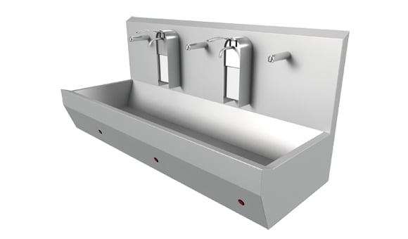 Lavatórios de aço inoxidável com design ergonômico e multiestação. A torneira misturadora é operada por joelho ou sensor, oferecendo o máximo nível de higiene. A abordagem de design higiênico evita o acúmulo de água.